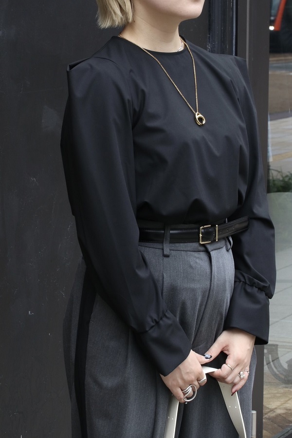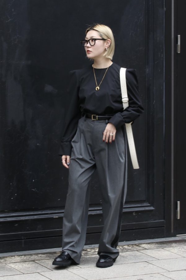 今回のコーデは、黒のシャツにグレーのパンツを合わせたモノトーンスタイル。