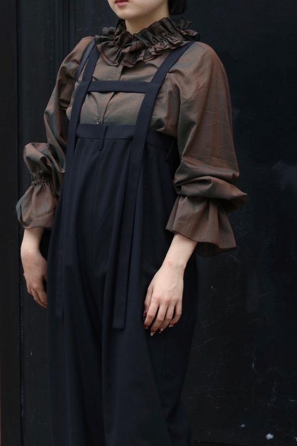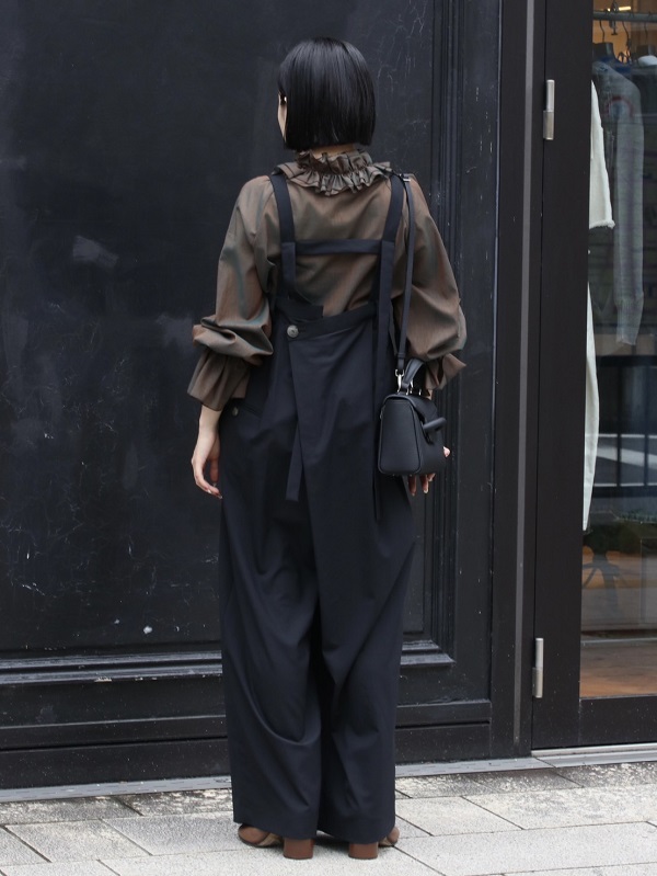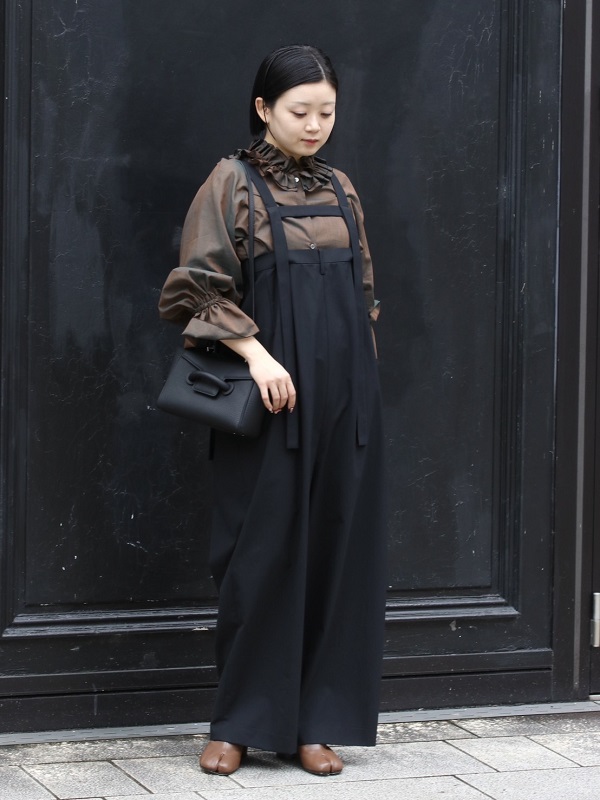 トレンドカラーのブラウンシャツに、ワイドな黒のオーバーオールを重ねたレイヤードで、こなれた大人カジュアルに。