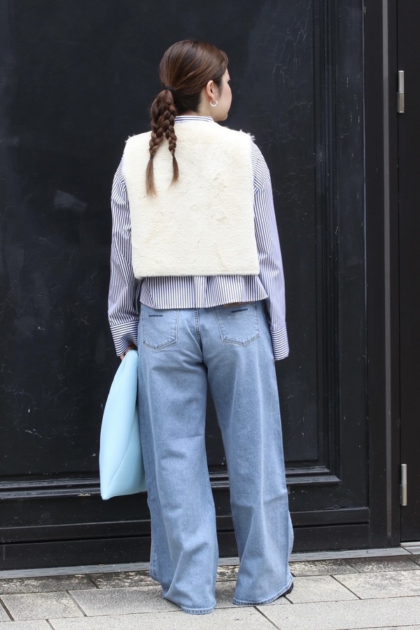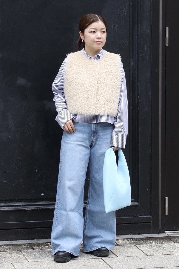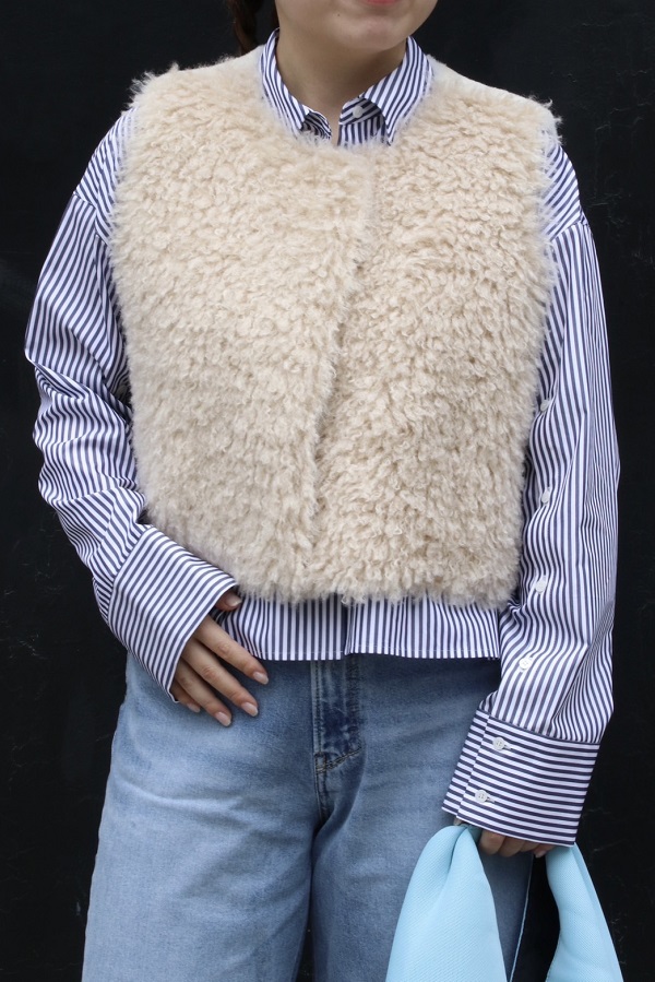 ストライプシャツにボアベストを重ね、カジュアルながらも季節感たっぷりの装いに。