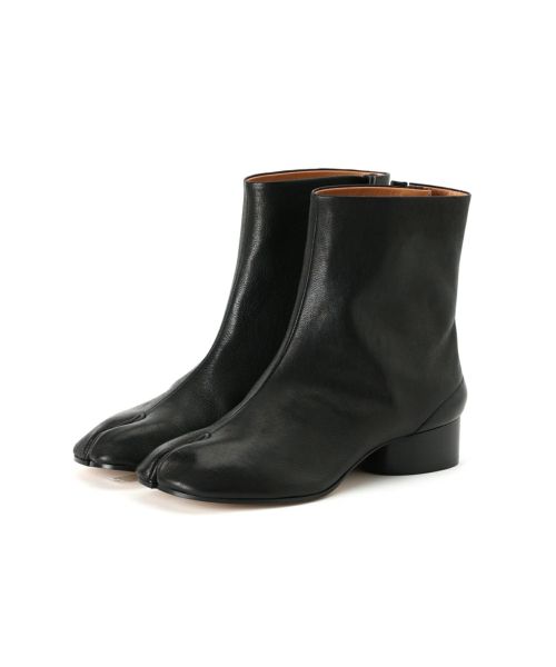 Maison Margiela(メゾンマルジェラ)のタビブーツ。 やわらかなナッパレザーを使用したタビブーツは、メゾンらしいアバンギャルドなデザインが特徴です。シンプルでありながら、スプリットトゥのシルエットが際立つ個性的な一足。高さ3cmのシリンダーヒールが程よい安定感を提供し、日常使いにも適した履き心地です。バックのホワイトステッチとフッククロージャーがアクセントとなり、どんなスタイルにも合う洗練された印象を与えます。