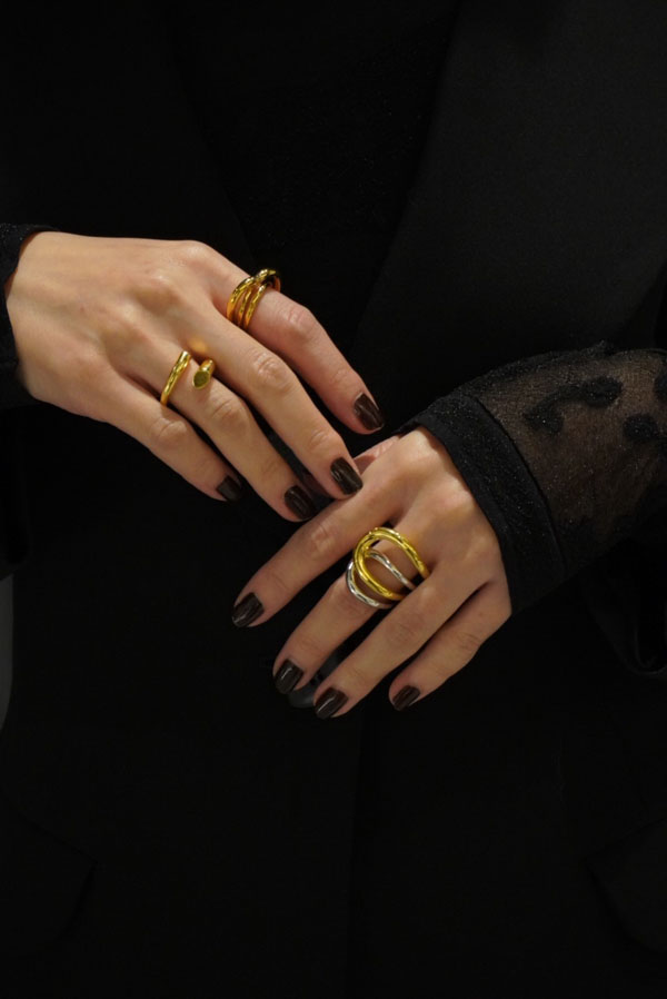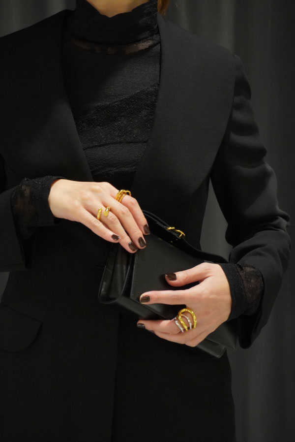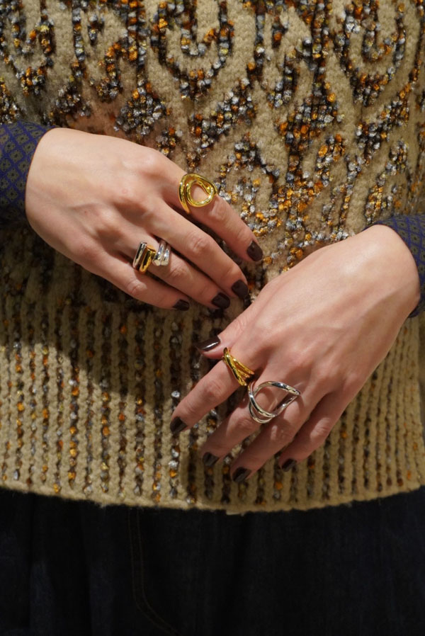 左手には存在感を放つ「DAISY RING」を。そして、右手には、彫刻作品からインスピレーションを得た「BISEAU」、PARIGOT別注のハートモチーフである「COEURLY RING」を組み合わせました。左手の「DAISY RING」は曲線的なボリューム&幅のある大ぶりデザインのため、右手は直線&幅が狭いデザインにより抜け感を出すバランスが◎