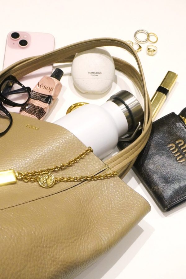 バッグに入れているのは、スマートフォン、財布、メガネやサングラス、リップ、香水、ハンドクリームです。マチがしっかりあるので見た目以上の収納量で、私の持っているバッグの中だと比較的大容量バッグです。また、口が大きく開くので物の出し入れもスムーズでデザイン性だけでなく、機能面でも優れています。