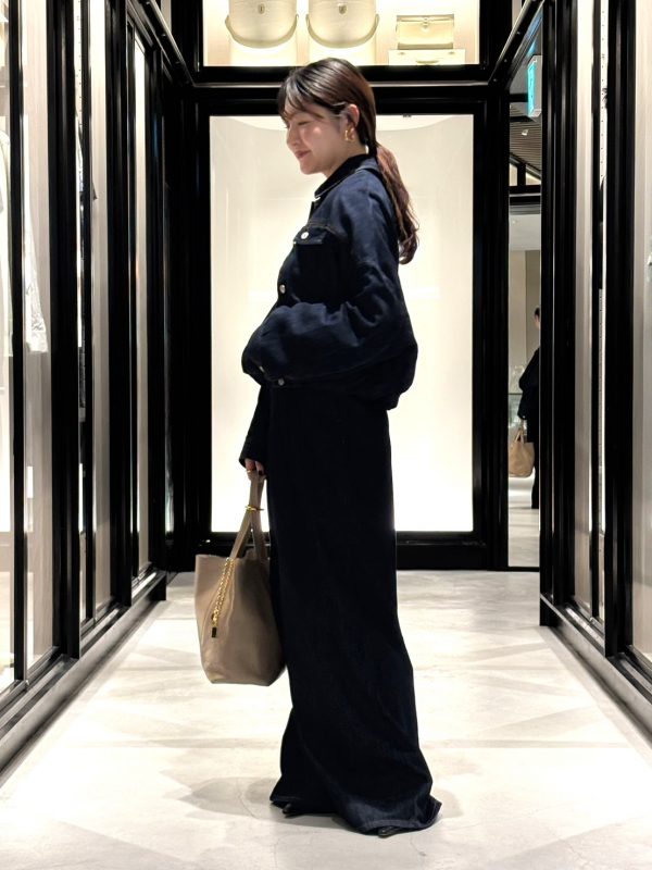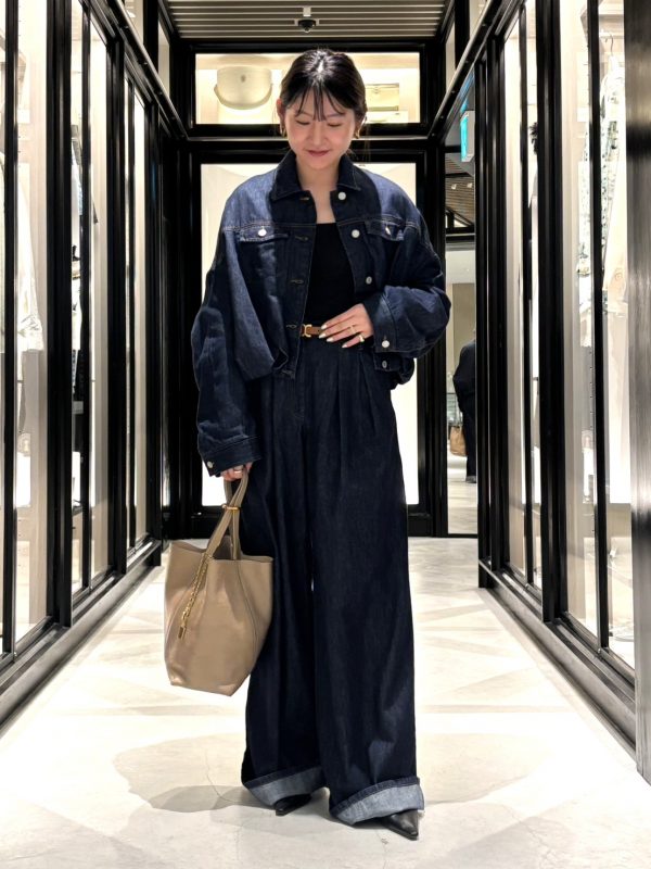 肩の力を抜いたデニムのセットアップスタイルは、このバッグの魅力を一層引き立てます。