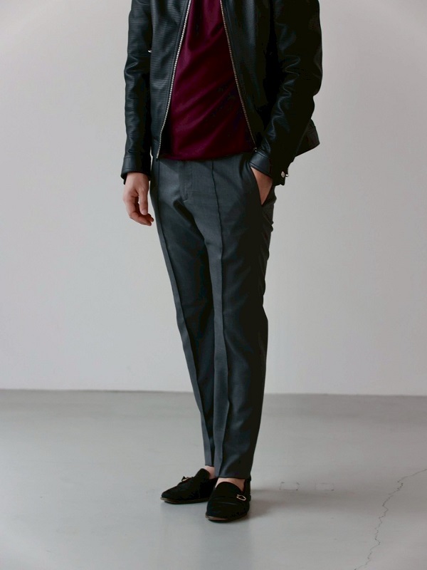 「スラックスなどテーラードジャケットに合わせるようなボトムスを合わせる。」