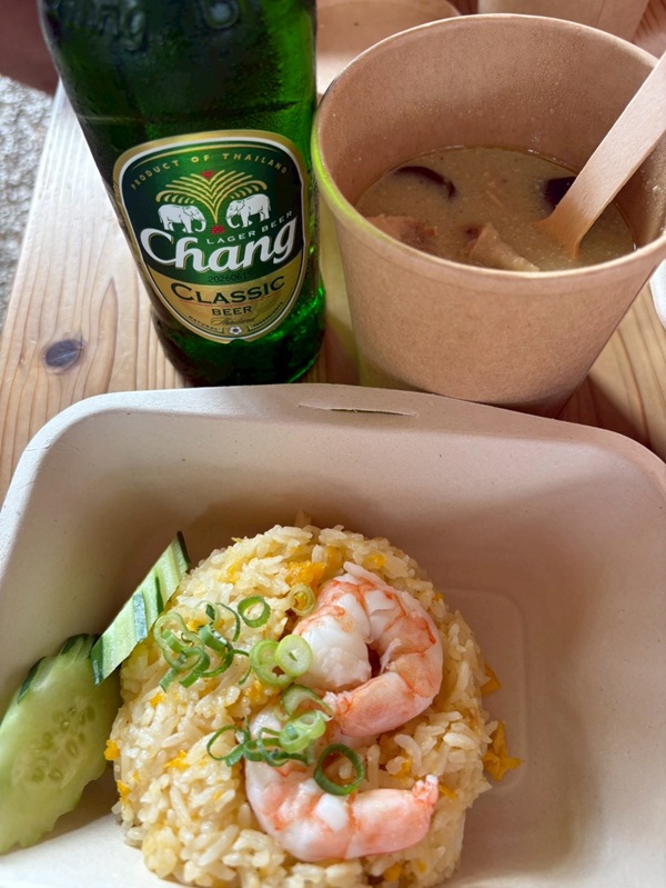まずはタイパビリオンでゲットしたグリーンカレーとエビピラフ