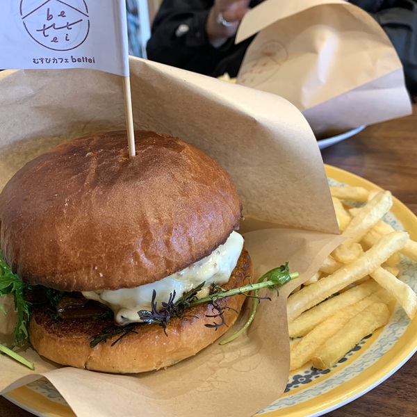 ご存知の方もいらっしゃるかもしれませんが、古民家カフェ『むすびカフェ bettei』へ。三原がたっぷり詰まったバーガーとチーズケーキを頂きました!