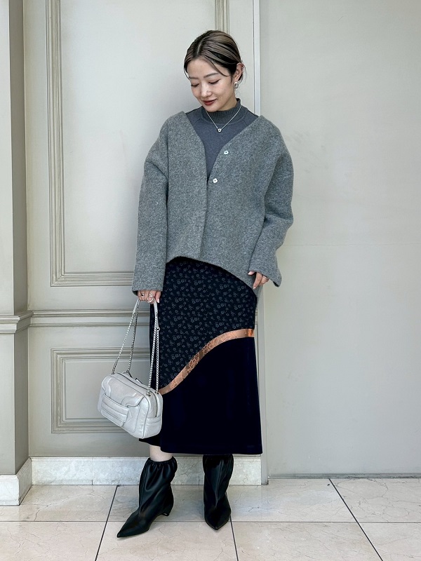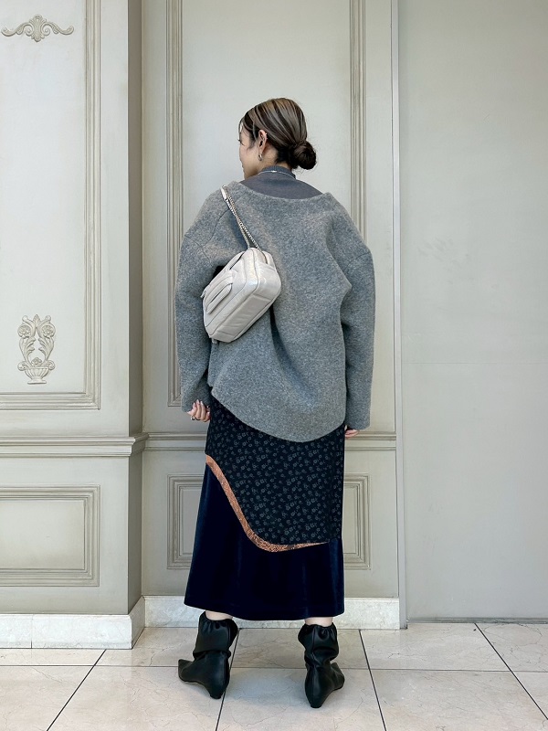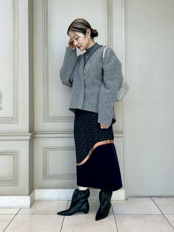 きれいめなスカートですが、グレーのニットと合わせることでデイリー要素もプラス。ディナーほどかしこまらない、けれど少し気合を入れた場所に行きたい時にオススメのコーディネートです。