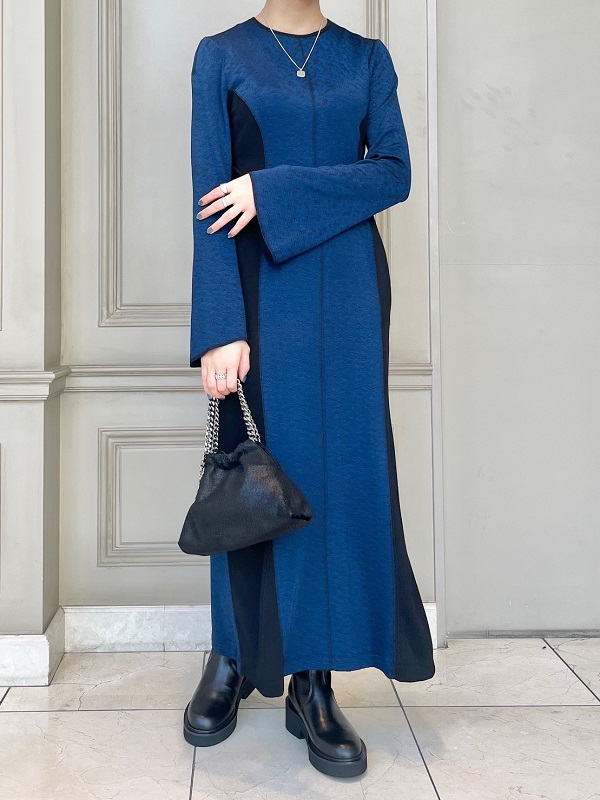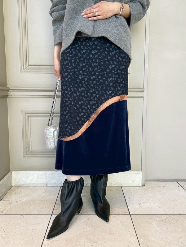 今季のマメのコレクションを代表する小花柄のジャガードのロングスカートがポイントです。トップスのトーンも抑えて、スカートのレースのカラーが自然に映える組み合わせ!