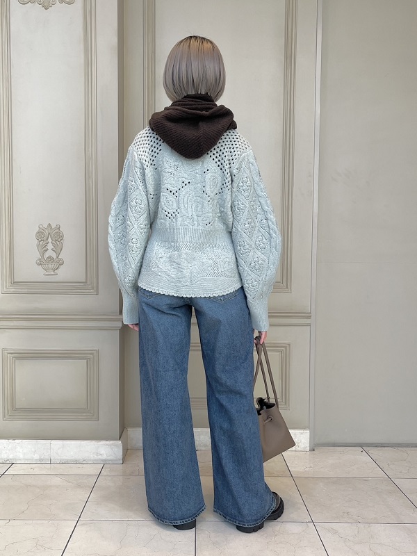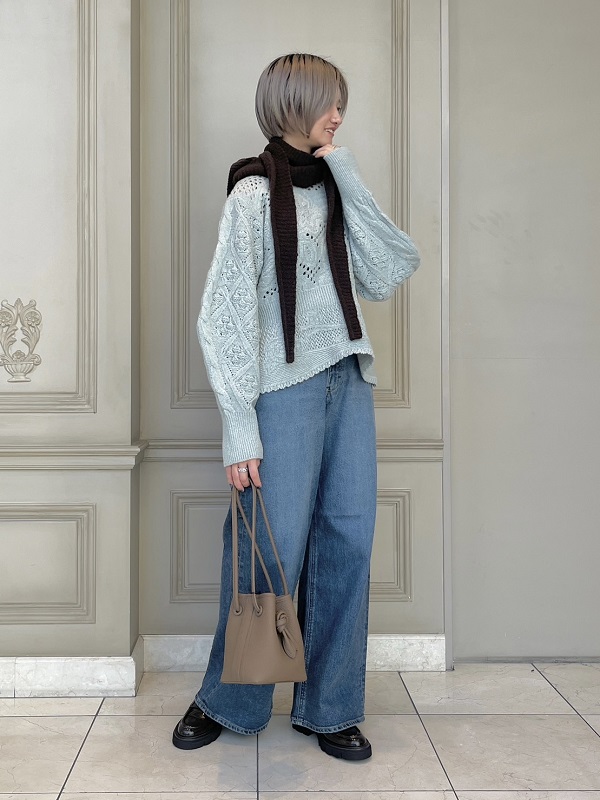 柔らかいブルーカラーのニットとデニムにブラウンの小物と合わせて色合わせを楽しむのもいいですよね!