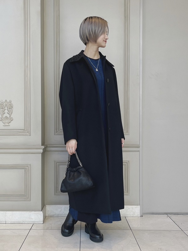 女性らしく華やかなシルエットのワンピースと、シックなウールコートを合わせて大人っぽくまとめました。