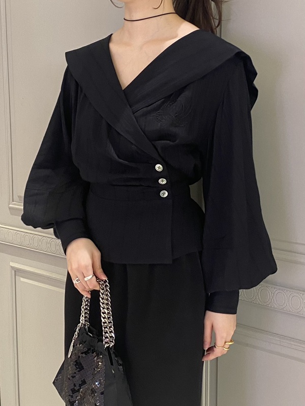 続いてはこちらの後ろ見頃のセーラーカラーが特徴的な 、ROSE JAQUARD STRIPE SAILOR COLLAR BLOUSE。