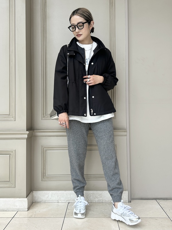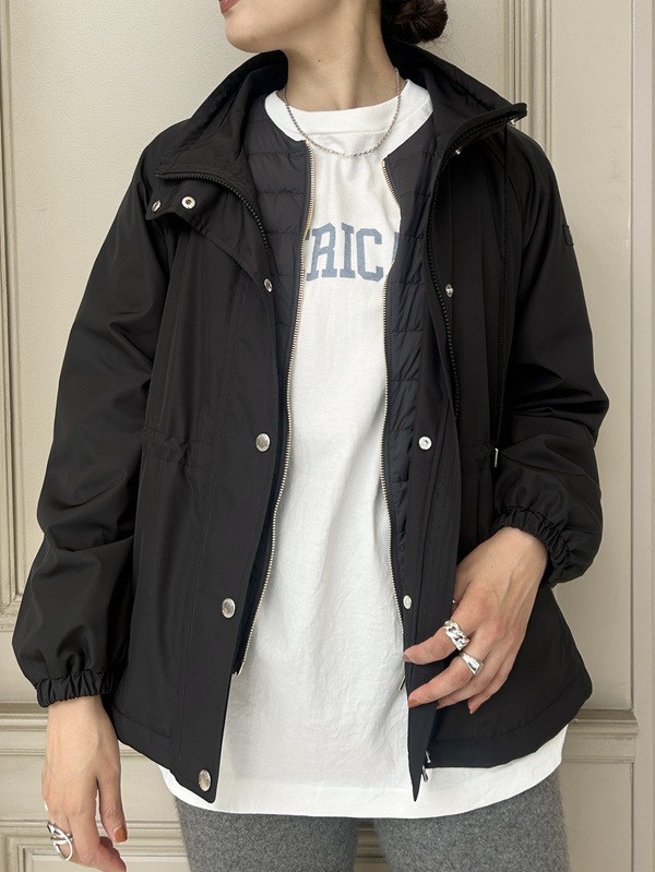 タトラスのシンプルなノーカラーダウン『NOKO(ノコ)』をインナーダウンとして、 ブルゾン『VICIA(ヴィチア)』をレイヤードしたカジュアルな着こなしです。