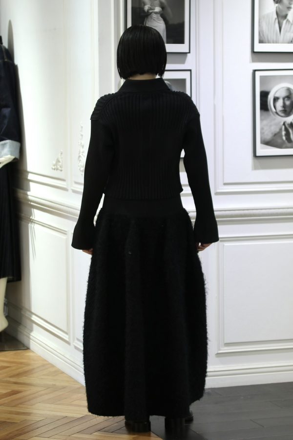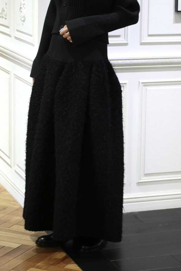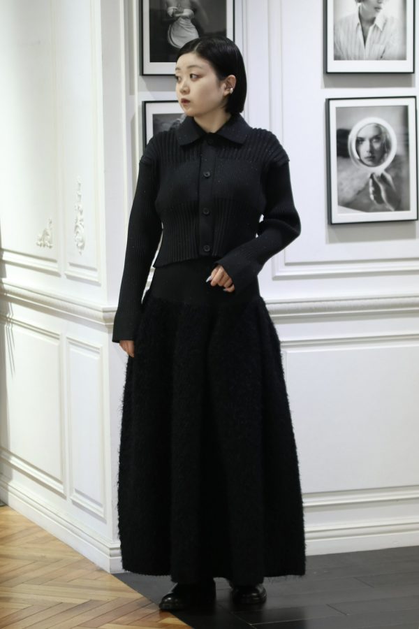 今季登場の パリゴ別注シャツカーディガン と、CFCL定番の POTTERY SKIRT から新しく登場した パイル織りスカート のスタイリングです。