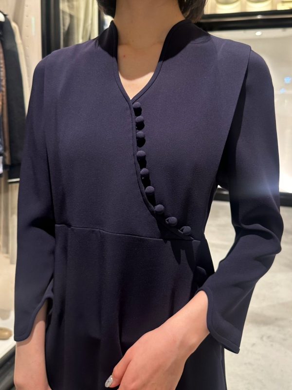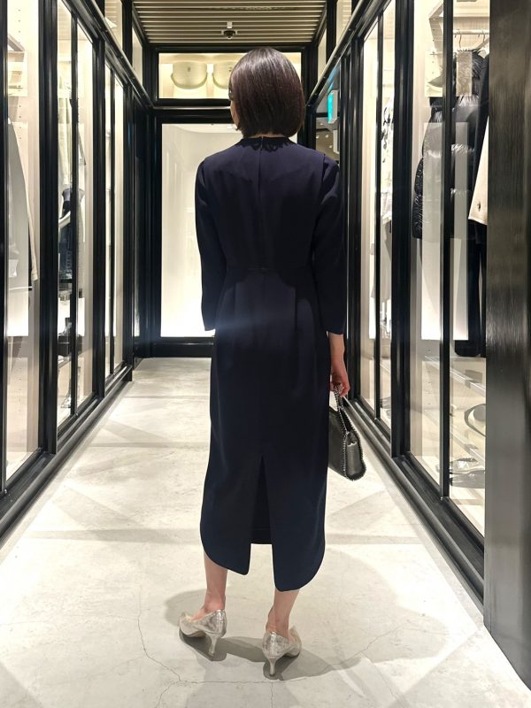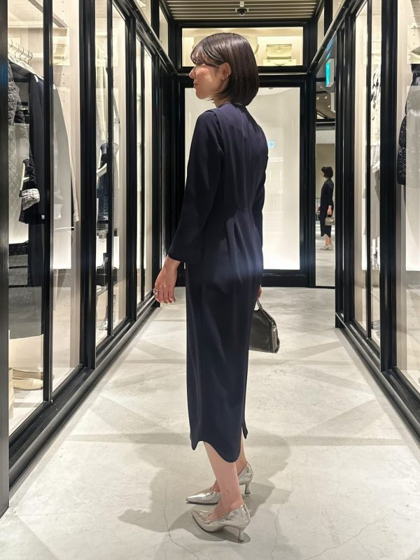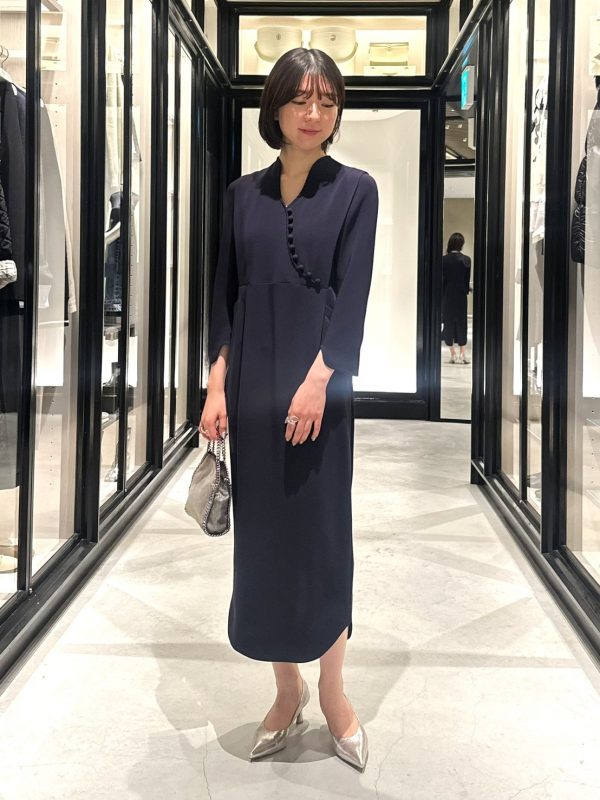 私のマイベストマメは「Triacetate Georgette V-Neck Dress」です。マメクロゴウチのシグネチャーデザインであるくるみボタンにまず惹かれました。派手な装飾がない分、着物から着想を得た襟のカーブや、身体のラインをしなやかに見せてくれる作りに大人な余裕を感じます。。年を重ねるほど、着たくなるそんな一着だと思い選びました。