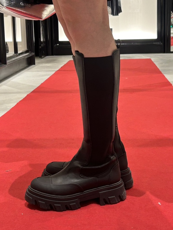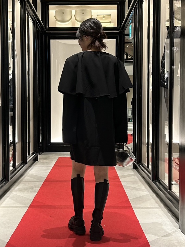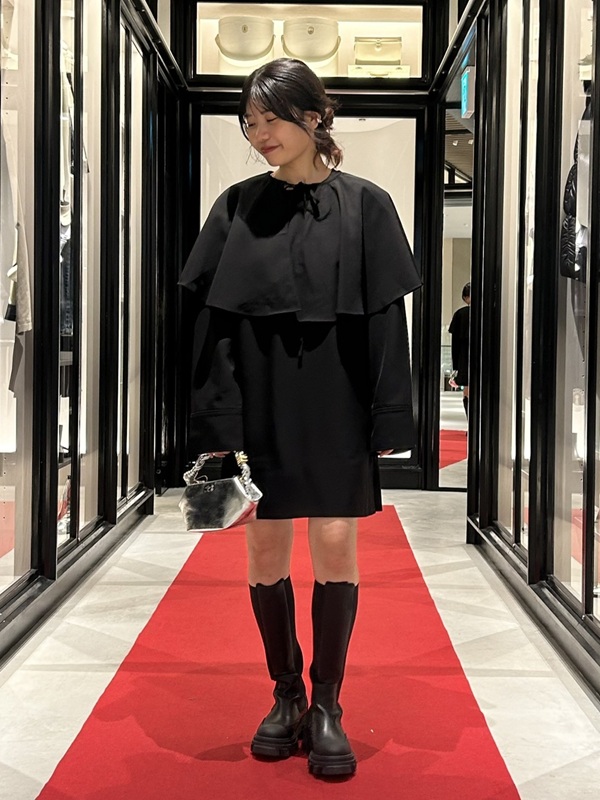 ロングブーツを合わせたオールブラックコーデで、モードな雰囲気に。