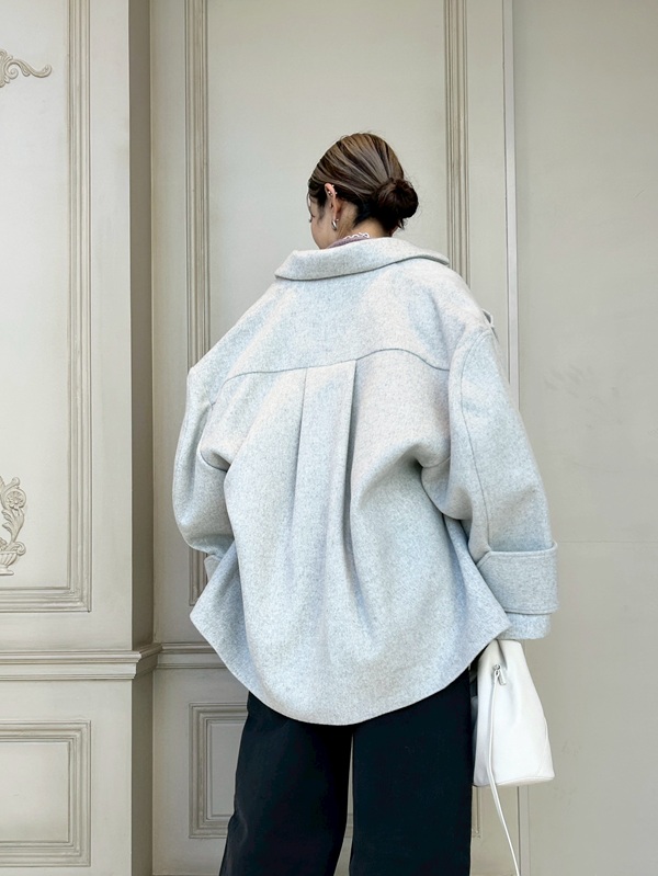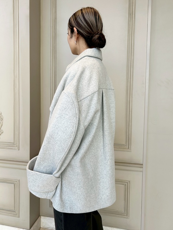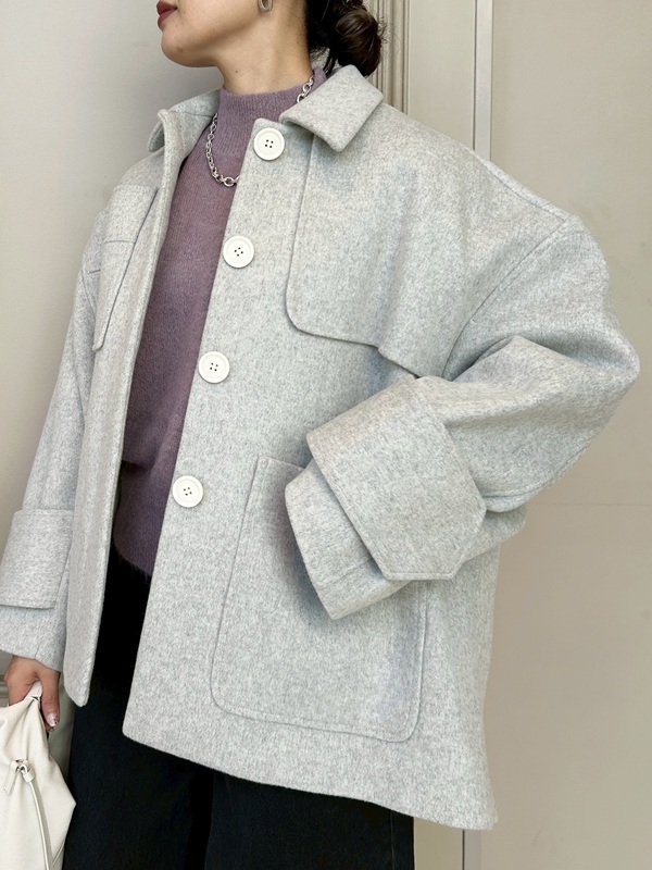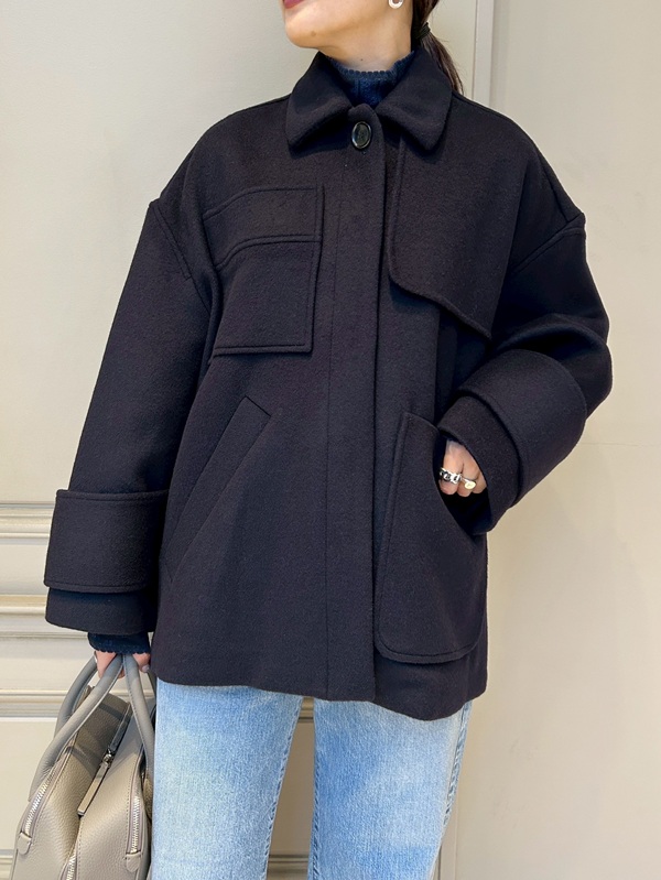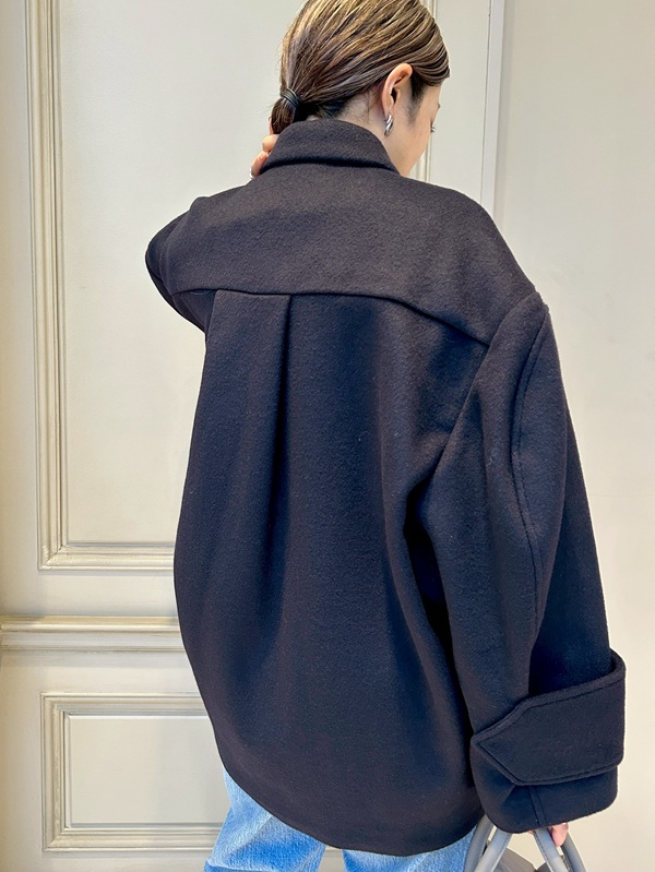 ミリタリーシャツのディテールを取り入れた、ラムウールのダブルフェイスのショートコート。