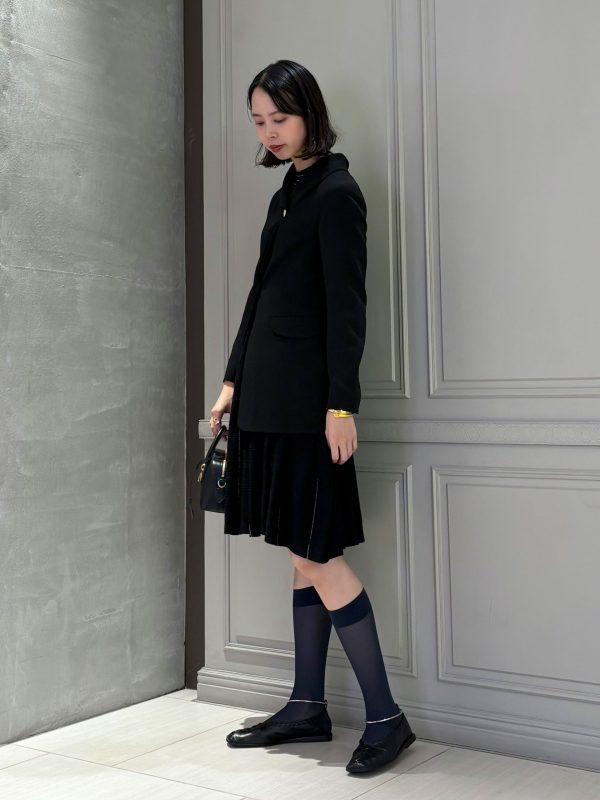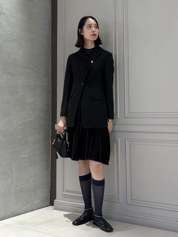 膝上丈のワンピースもジャケットと合わせると上品にまとまります◎