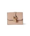 コンパクトでありながら、洗練された存在感を放つミニウォレットです。フロントにはブランドらしいチャーム付きレザーリンクがアクセントとして施され、シンプルながらもエレガンスと遊び心を兼ね備えたデザイン。