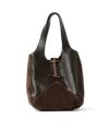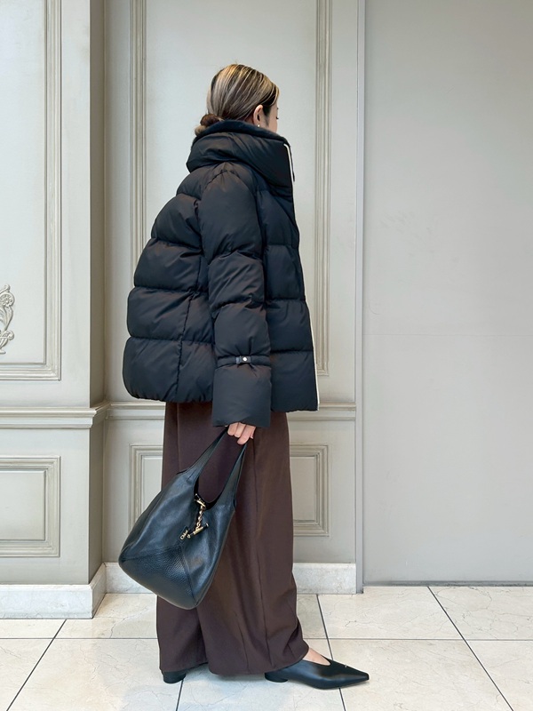 グレインバッファローレザーとシャイニーグレインカウハイドを組み合わせたデザイン。異なる質感のレザーが織りなす奥行きのある表情と、バルーンのようにふっくらと丸みを帯びたシルエットが、フェミニンさと洗練さを同時に引き立てます。