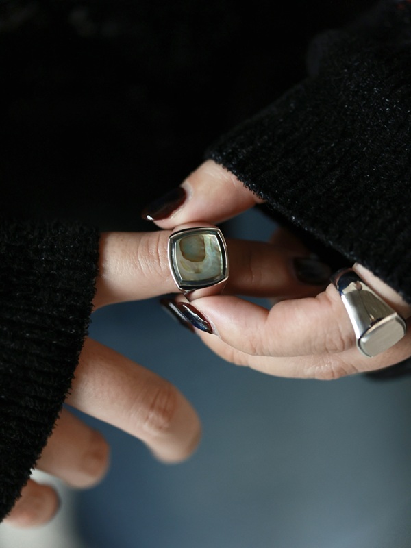Tom Woodのアイコンリングの「CUSHION」に水面に輝く月や光の反射を思わせる希少な天然石アバロンシェルをセットした特別別注モデル。