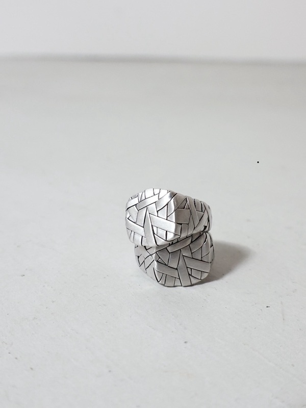 リング表面には、均一で緻密な”キルティングパターン”が浮かび上がり、光を受ける角度によって幾何学的な陰影が繊細に変化します。
