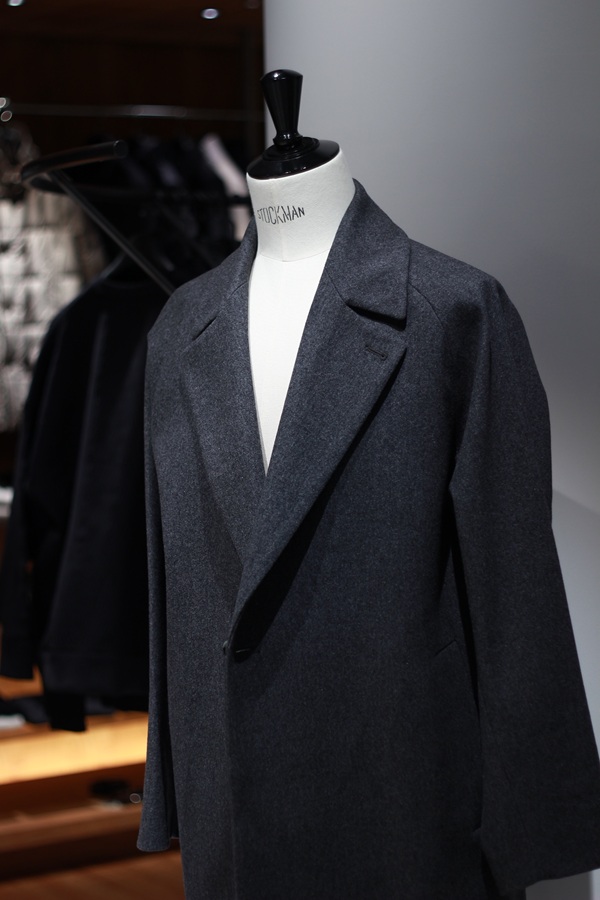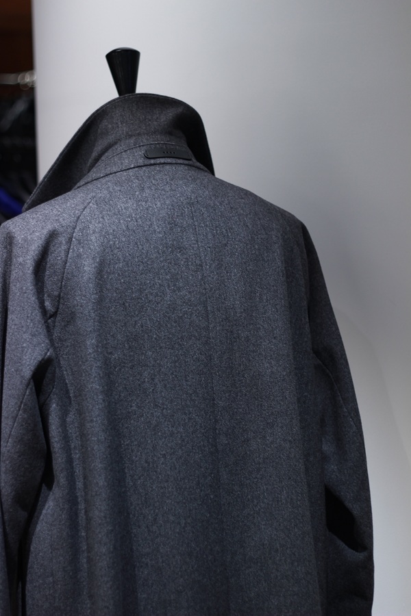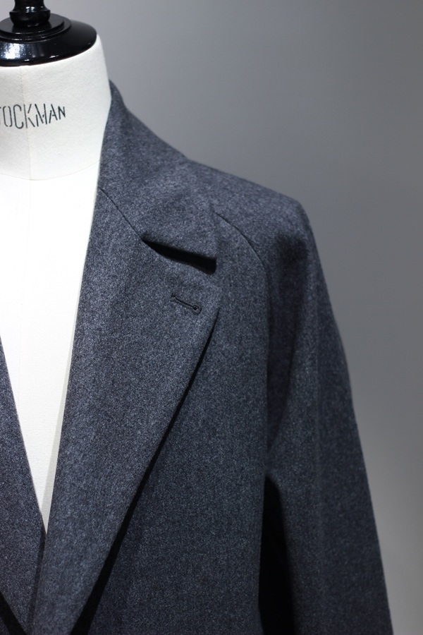 まさに今の気分のフレンチっぽさ、フィッシュマウスのラペルにやや低めのゴージライン、流れるようなラグランスリーブが見事に融合し、クラシックな魅力の中にさりげなくモードな雰囲気が共存している他にはないコートに仕上がっています。
