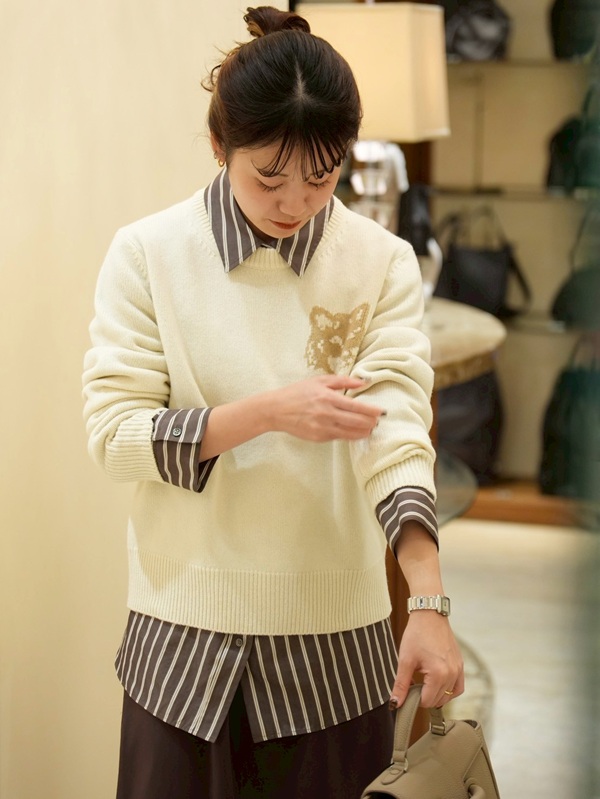 胸元に小さく佇むキツネの刺繍は、可愛らしさと大人のユーモアを絶妙にミックスしたブランドの象徴です。