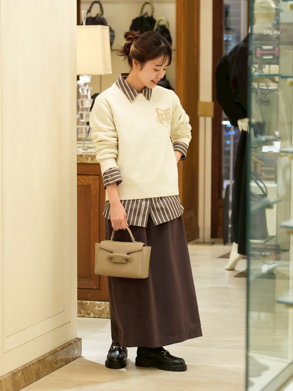 スウェットやニットはもちろん、Tシャツやカーディガンなど、季節を問わず展開されているシリーズですが、特に冬は厚手のアウターとのバランスが良く、胸元に刺繍が覗くことでスタイリング全体がグッと締まります。
