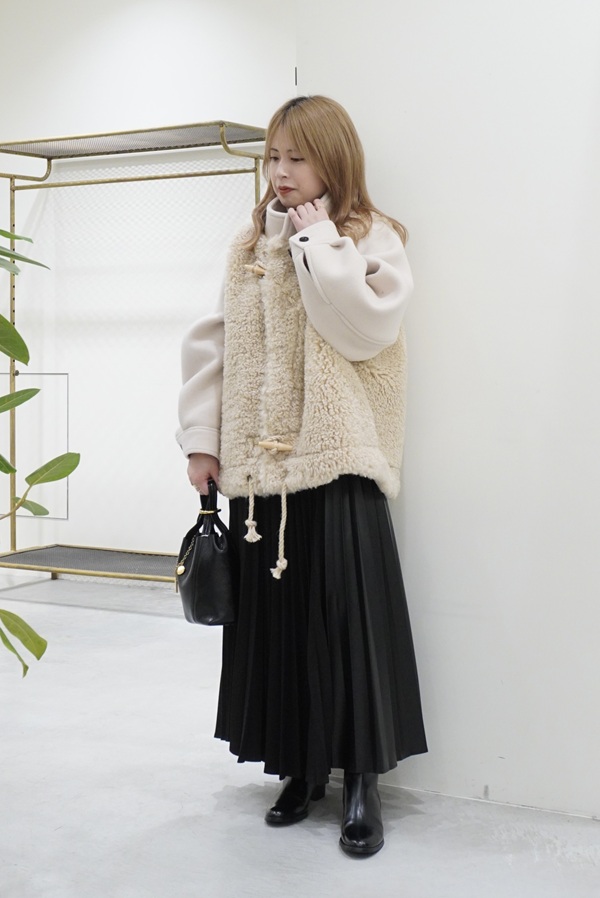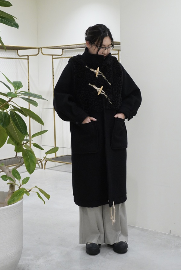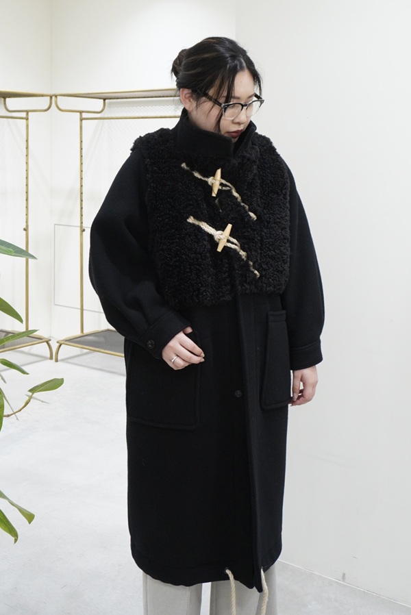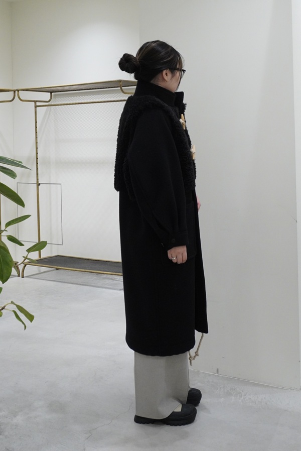 身頃のファーが印象的なDOUBLE FACE FAUX SHERLING DUFFLEです。