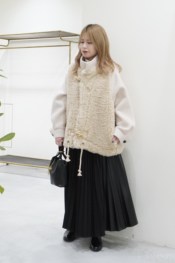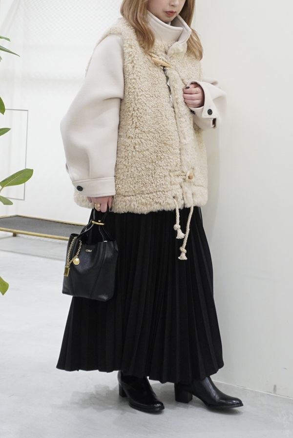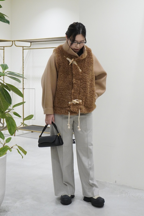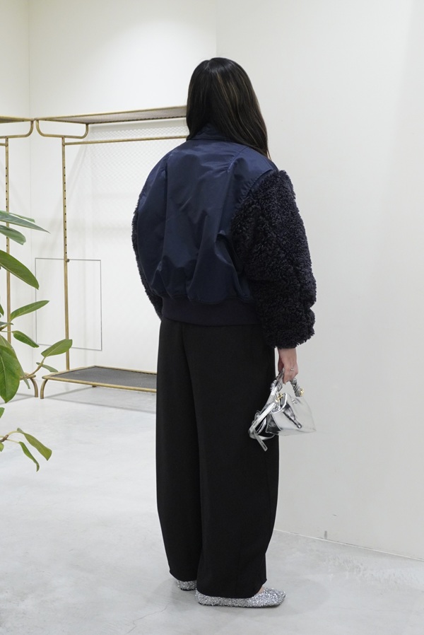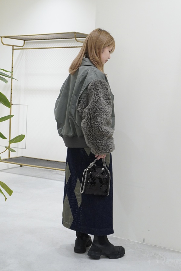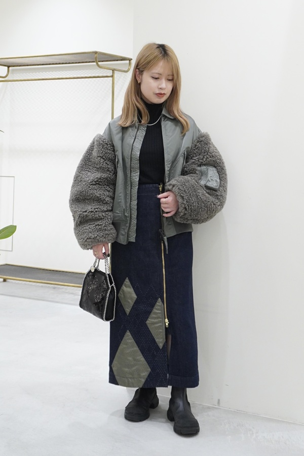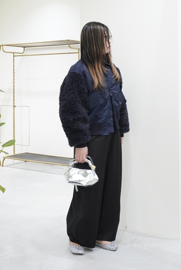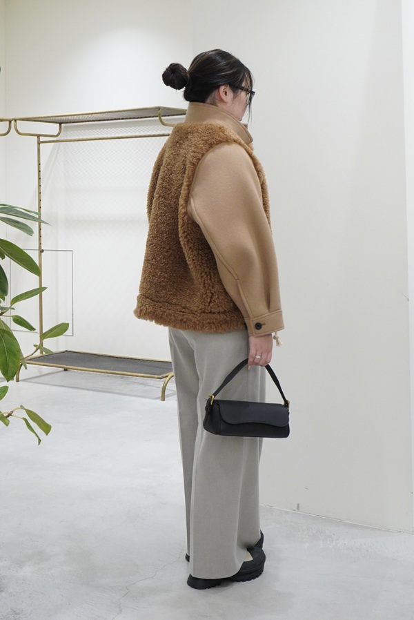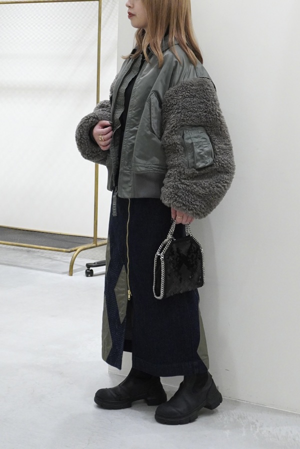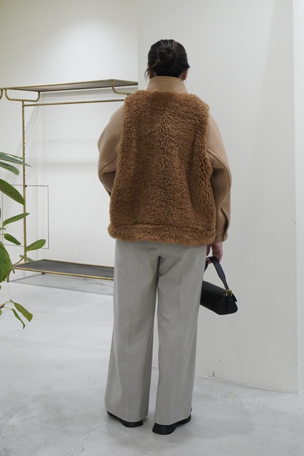 少しコンパクトな着丈になりますが、ボアのボリューム感が程よく全身のバランス感となじみます。