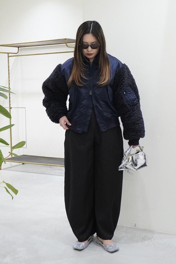 ダブルジッパーなので、ボトムスのシルエットにボリューム感がある時は下のジップを上げてバランスをとるのもオススメです!
