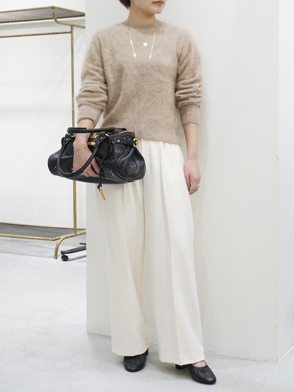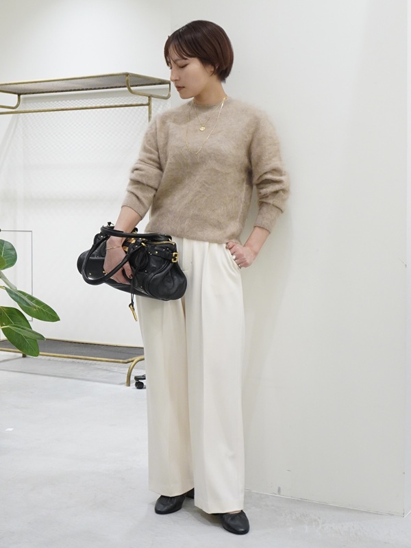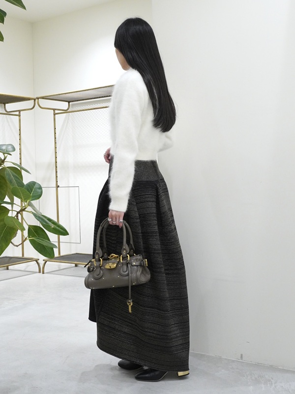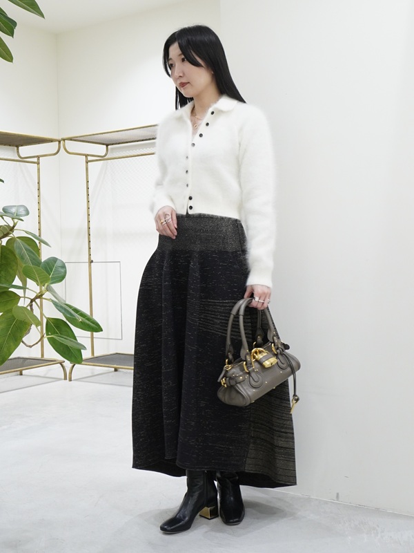 ホリデーらしさを意識して少し華やかなアイテムでスタイリングしてみました✨この時期は白ニットが着たくなるのは私だけでしょうか…(笑)