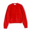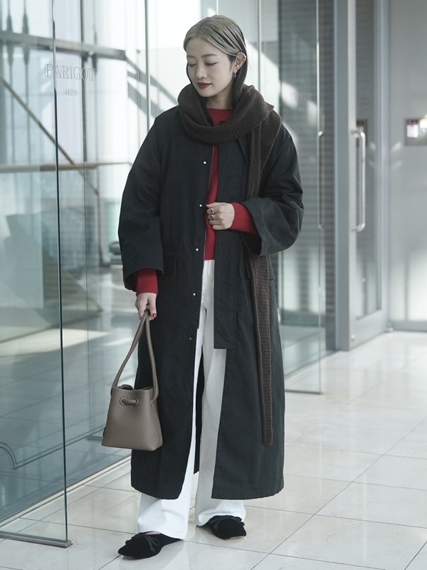 ミニマルでありながら存在感のあるシルエットは、羽織るだけでスタイリングを洗練させた印象にしてくれます。インナーには、鮮やかな赤が目を引くカシミヤニットを合わせて。冬の装いにさりげない華やぎを添えながら、ボトムに合わせた白いデニムパンツが重くなりがちな冬のスタイリングに抜け感をプラスします。