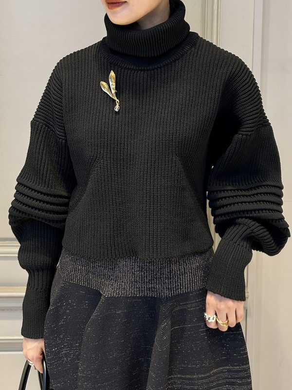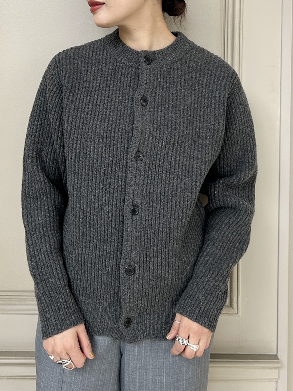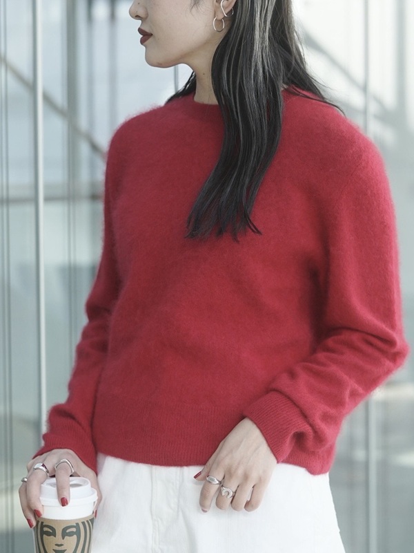 インナーに合わせたニットは、無駄を削ぎ落としたデザインと、体に自然に沿うリブの表情が、アウターの存在感を引き立てながらスタイリング全体を上品にまとめてくれます。