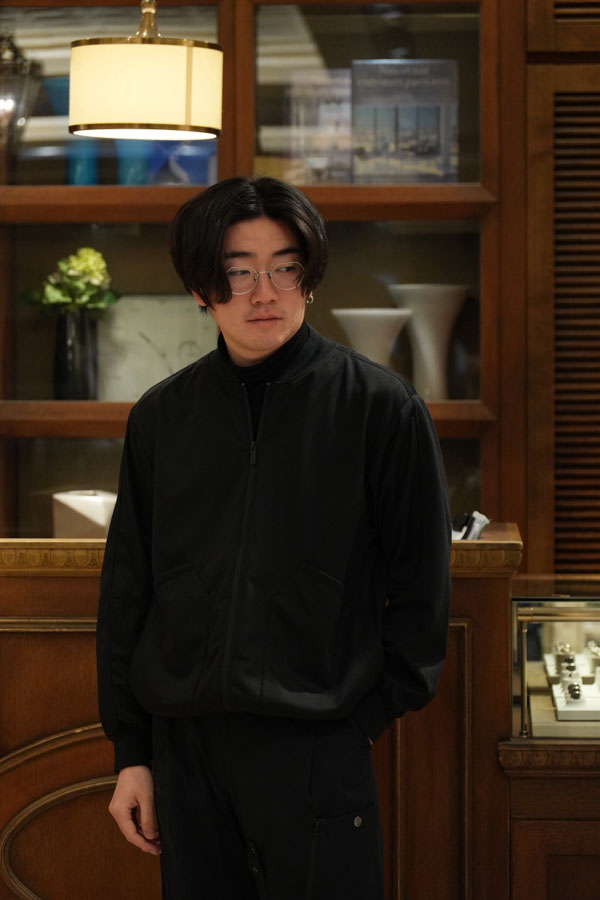 インナーには、先染めによる美しいメランジ調の表情が特徴的なMA-1ブルゾンを合わせ、同じアウターでも異素材のアイテム同士を組み合わせています。