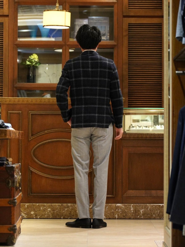 イタリアの人気シャツブランド「Giannetto(ジャンネット)」の定番ジャケット「CORALLO(コラッロ)」をメインにした、ジャケパンスタイル。モックネックニットでカジュアルに、スラックスにローファーでドレス要素も組み込んだ、大人の休日スタイルとしてカジュアルに着こなしています。