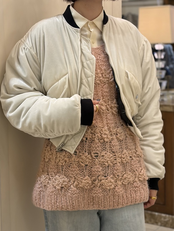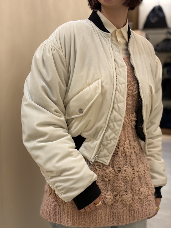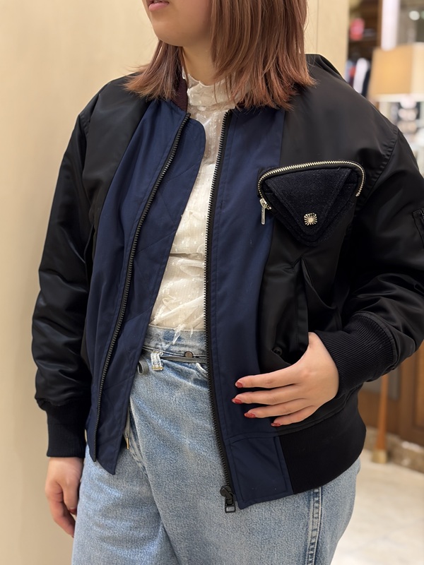 ベロア調の上質な光沢とバイカラー配色で、スポーティーなイメージのあるMA-1が、どこか上品な印象でお召しいただけます