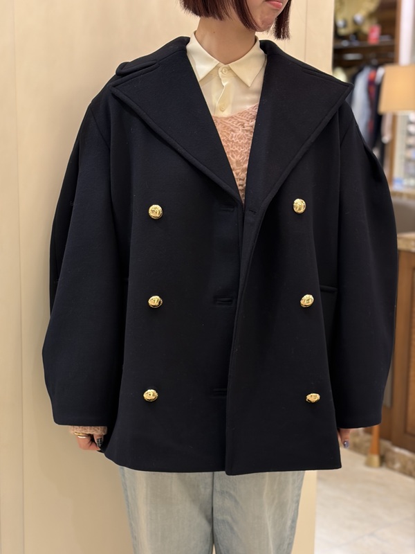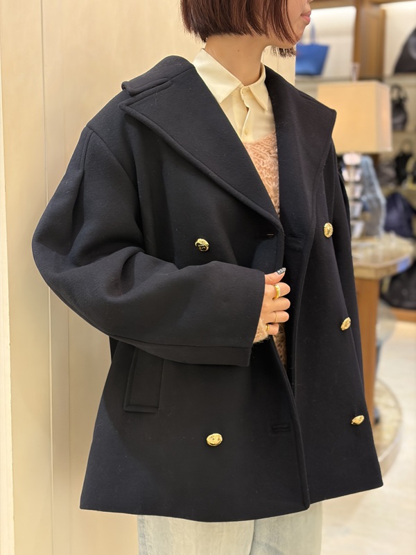 ネイビーの落ち着いたカラーとゴールドボタンで、きちんと見えも叶うピーコート。