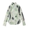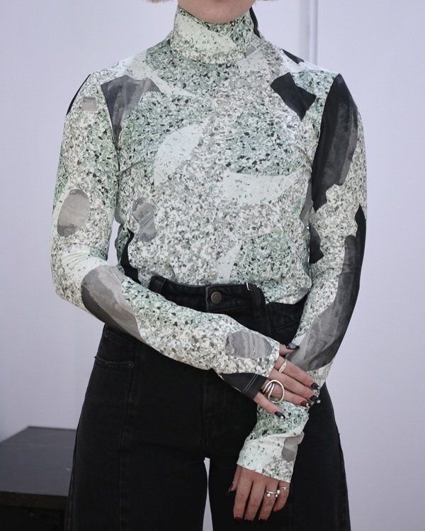 地層石の断面から着想を得たマーブル模様を全面にプリントしたハイネックトップです。