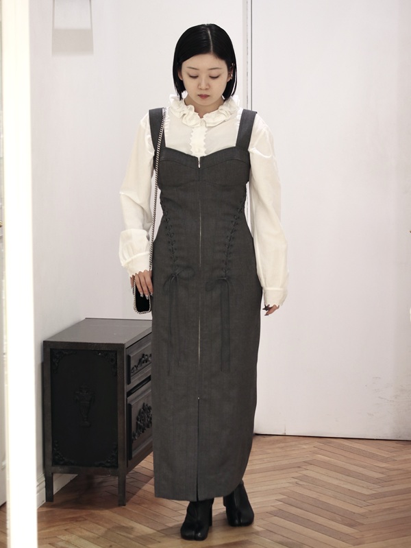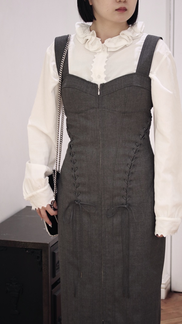 ヴィンテージのコルセットから着想を得たデザインで、ウエスト周りを細く見せるレースアップのディテールや、女性の身体のラインを美しく引き立てるシルエットが魅力です。