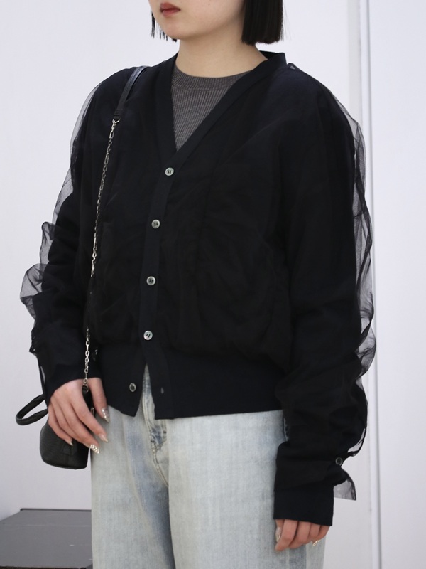 シルエットはベーシックな形のカーディガンですが、チュールをボリューム感たっぷりに重ねたデザインとなっています。