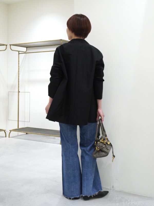 少しカチッとした黒ジャケットにカジュアルなデニムを合わせたスタイリング。アクセサリーもバッグの金具とマッチしたゴールドで合わせたいです。カラーを抑えることでバッグの上質さと存在感がより引き立ちます。