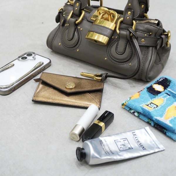 バッグに入れているのは、フラグメントケース、スマホ、リップ、ハンカチ。必要最小限のアイテムはしっかりと入るサイズです。パリゴでも取り扱いのあるLE COUVENT MAISON DE PARFUM(ル クヴォン)のハンドクリームは自然を感じさせるような安らぐ香りでいつも癒されています。まだしっかり入る容量はあるのですが、荷物少なめでくたっとさせて持つのが可愛い気がします。