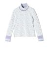 デニムの他には、黒やラベンダーの単色など、ニットに使われているカラーのボトムを合わせると品よく纏まります。