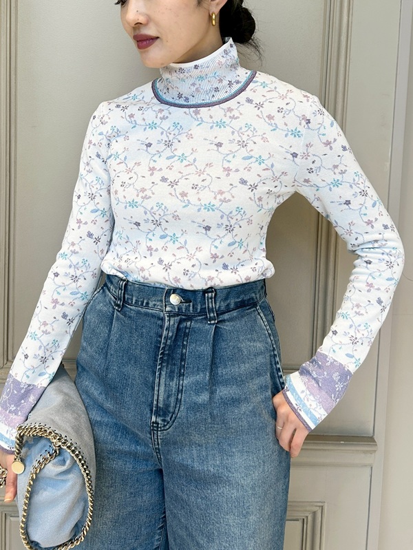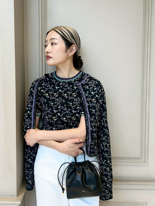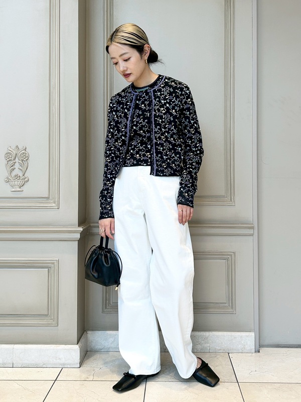 春に履きたくなる白デニムと、ブラックのフローラルモチーフのニットをレイヤードしたスタイリング。