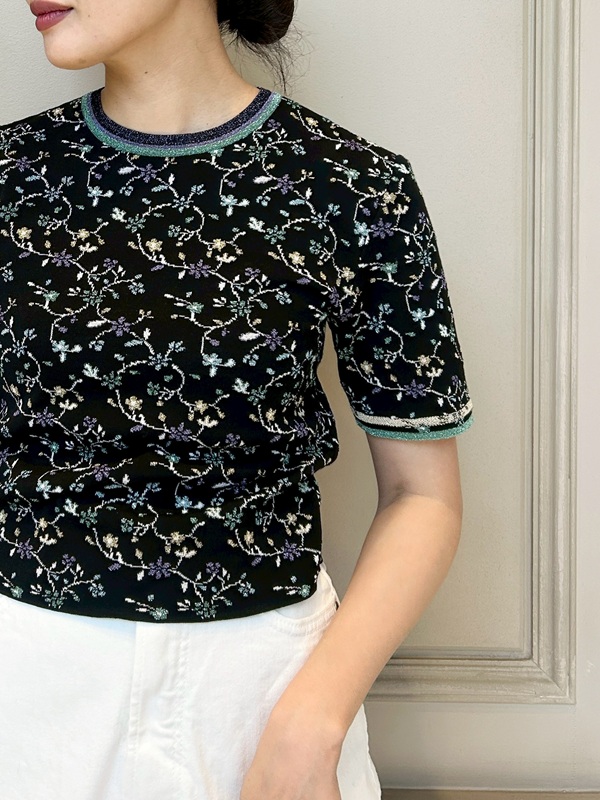 【Mame Kurogouchi(マメ クロゴウチ)】 Floral Motif Glitter Short Sleeve Knit Top