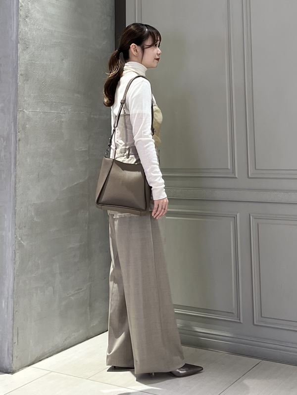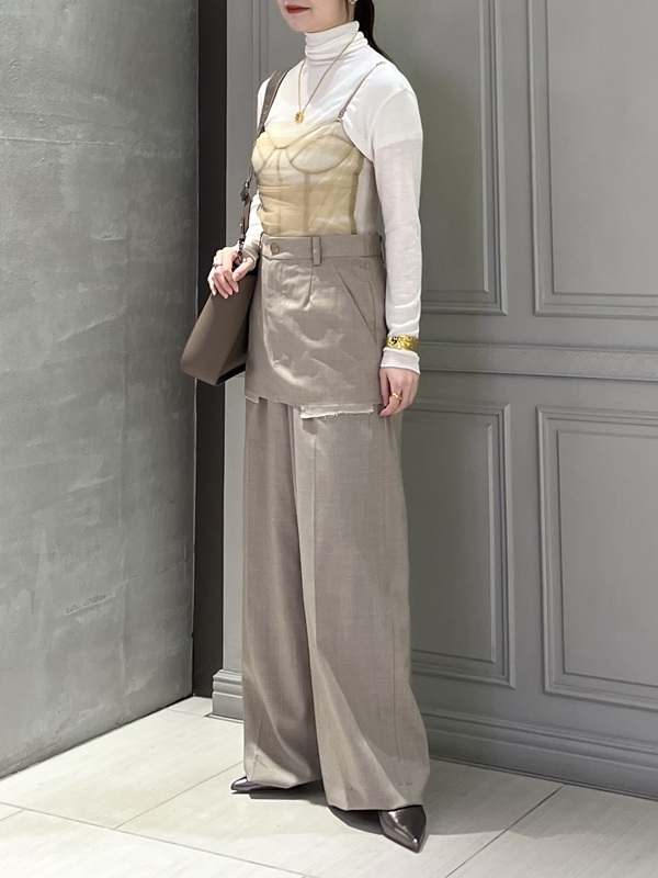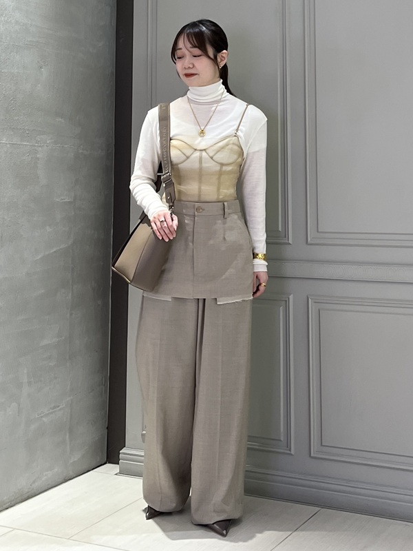 軽やかな素材なので春夏はもちろんですが、まだ肌寒い今の時期にはニットやウールなど秋冬素材に合わせた、異素材MIXスタイルも楽しめて、季節問わずコーデのポイントになります。