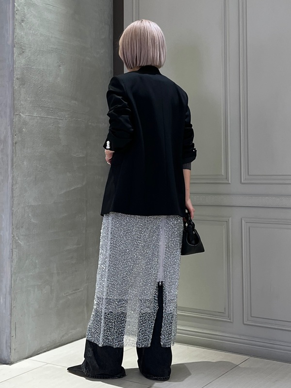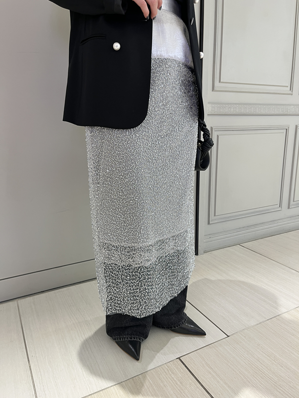 繊細なビーズ刺繍が全面に施された、存在感のあるスカート。動くたびにキラキラと光を反射して、コーデに程よいエッジと上品さをプラスしてくれます。