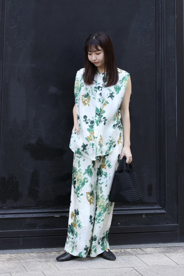 柔らかな配色と抜け感のある柄で、セットアップでも重たく見えず、さらっと着られる一着。
