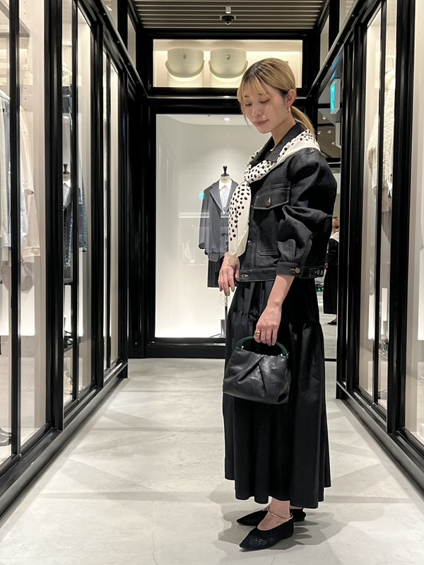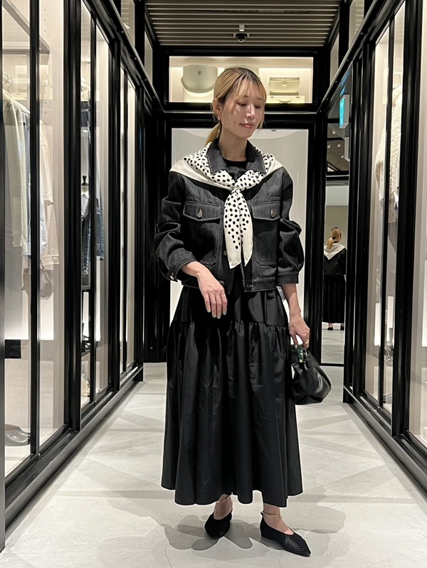 エレガントに見えがちなワンピースに、張り感のあるデニムジャケットで普段のちょっとしたお出かけムードに。明るいカラーのシルクスカーフをプラスし、軽やかな春のムードを演出いたしました。